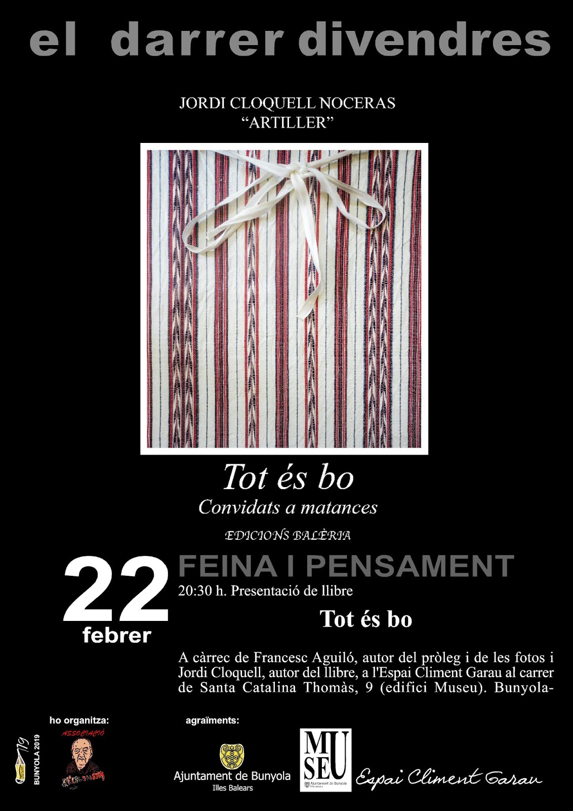 24 de setembre, a les 20:00h, al pati de l'Escola Mestre Colom de Bunyola. Serà un tast de cerveses artesanes elaborades a Bunyola (cerveseria Juntos) amb maridatge gastronòmic i un companatge aportat pels Fogons de Plaça.